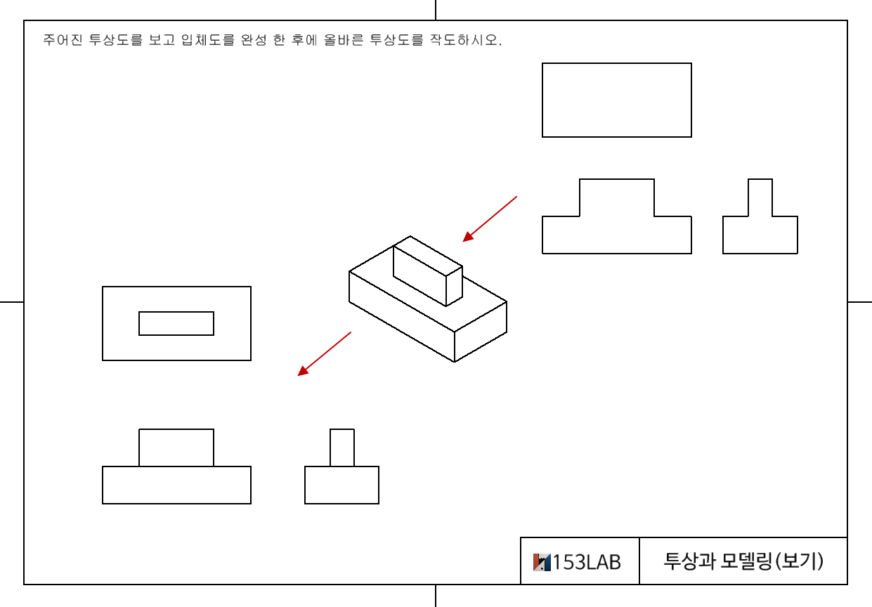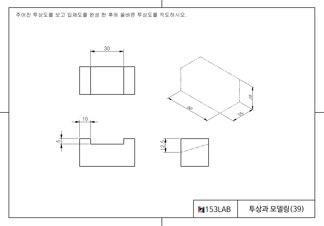 주어진 투상도를 보고 입체도를 완성 한 후에 올바른 투상도를 작도하시오.