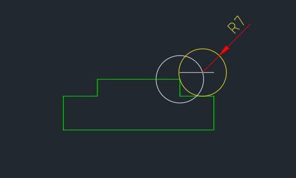 원과 직선의 교차 점을 원의 중심점으로 하여 반지름(R7)의 원을 그린다. 한 모서리는 지나고, 다른 직선에는 접하는 원이 만들어진다.