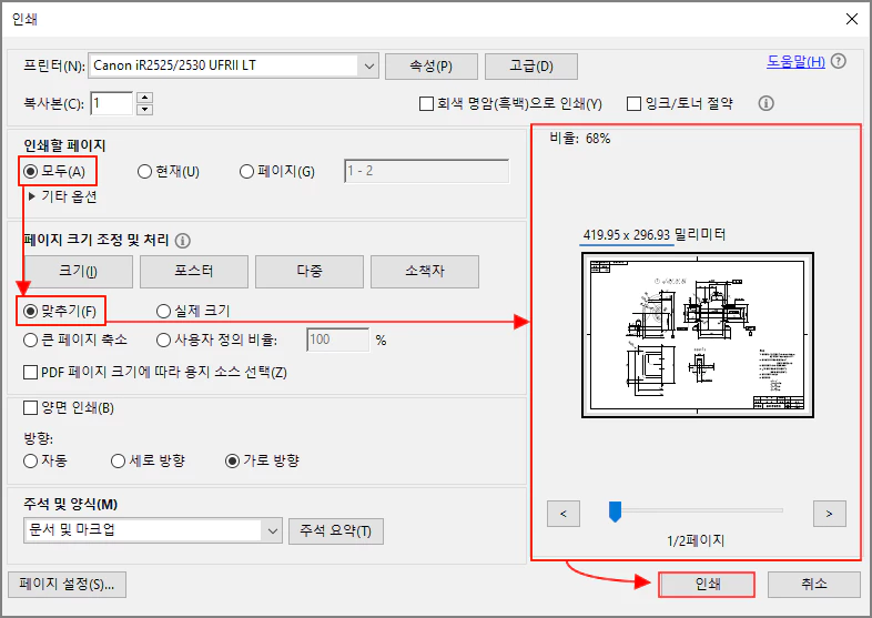 PDF 뷰어에서 도면 출력 방법과 옵션