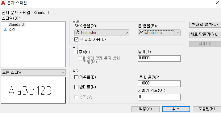 상단의 글꼴에서 기본체는 isocp.shx로 하고 큰 글꼴(확장폰트)은 whgtxt.shx로 한다.