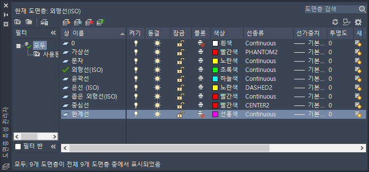 외형선, 가는 실선, 숨은선 레이어는 인벤터와의 빠른 변환을 위해 인벤터에서 사용하는 이름과 같이 만든다.
