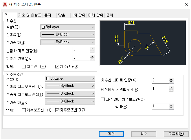 치수스타일에서 맞춤, 대체 단위, 공차는 설정되어 있는 데로 사용하면 되며,
