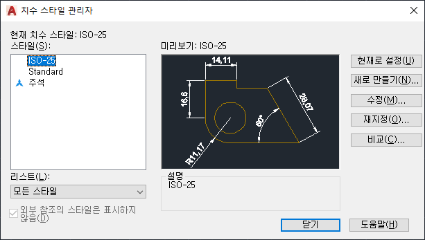 치수 스타일 관리자 메뉴에서 현재 스타일을 반드시 ISO-25로 설정하고 닫기 버튼을 누르기 바란다.