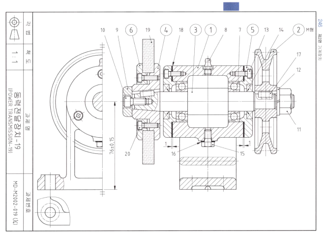 2D 부품도 : 본체, 축, 플랜지 커버, V-벨트풀리