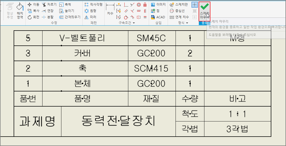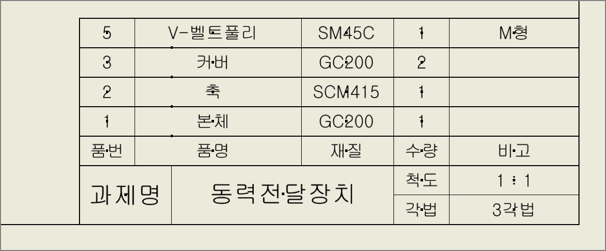 과제명과 품번, 품명, 재질, 수량은 작도해야 할 부품에 대해 맞춰야 하며, 비고란에는 V-벨트 풀리가 있을 때는 V벨트의 형별을 적어 놓지만 V-벨트 풀리 외에는 비고란은 비워 놓는다.