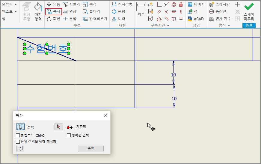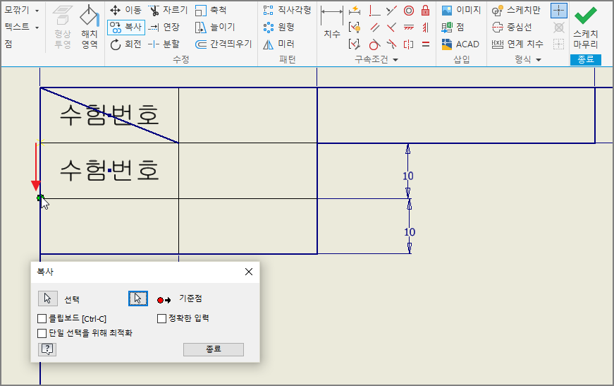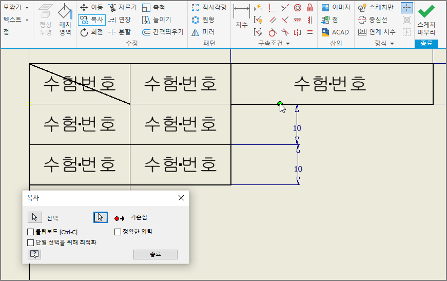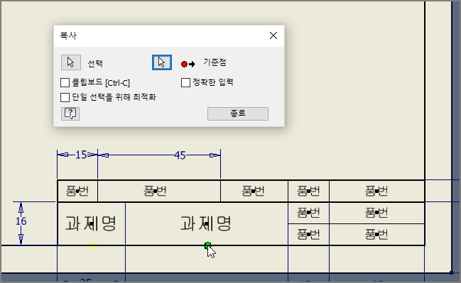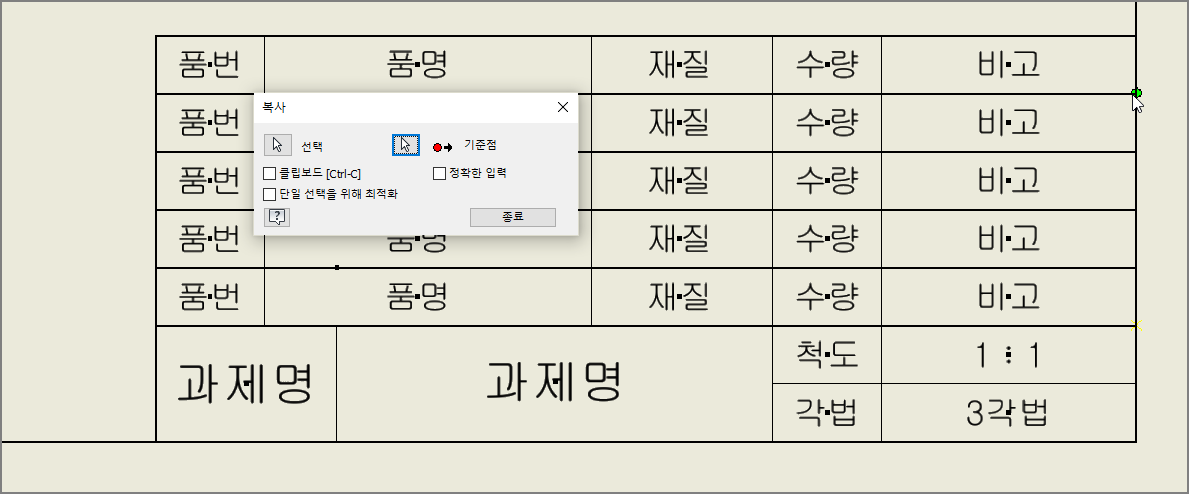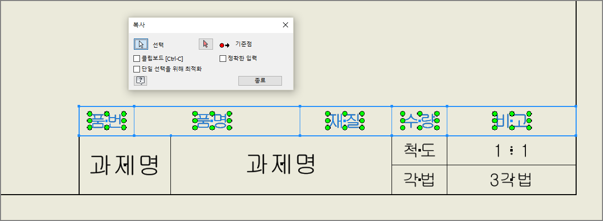치수는 모두 삭제하고, 작도할 부품 수에 맞추어 부품란만 선택하여 복사한다.