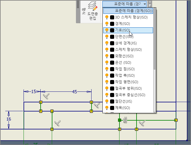 왼쪽 안쪽에 있는 3개의 직선(그림의 초록색 선)을 선택하고 선의 굵기를 변경하기 위해 [주서] 메뉴의 도면층에서 기호(ISO)로 변경하여 준다.
