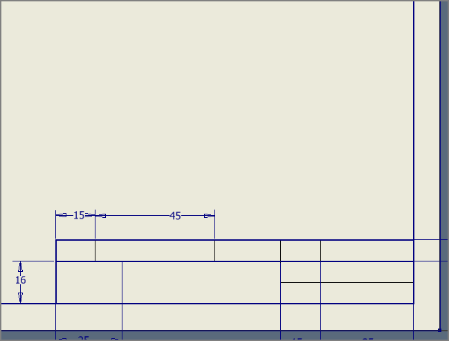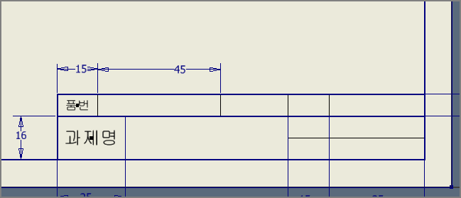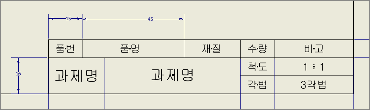 (전산응용기계제도기능사는 왼쪽 40, 오른쪽 60으로 요강에 나오지만, 그렇게 하면 칸이 좁아 글자가 모두 들어갈 수 없어서 왼쪽을 45로 한다.)