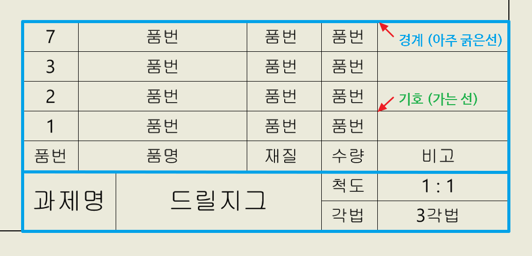 [선]을 이용하여 세로로 부품란의 칸을 나누고, 치수기입한다.