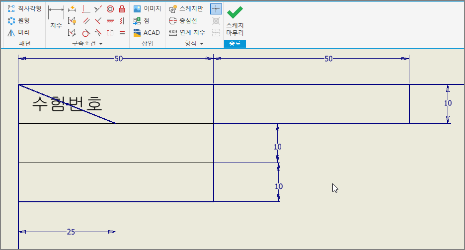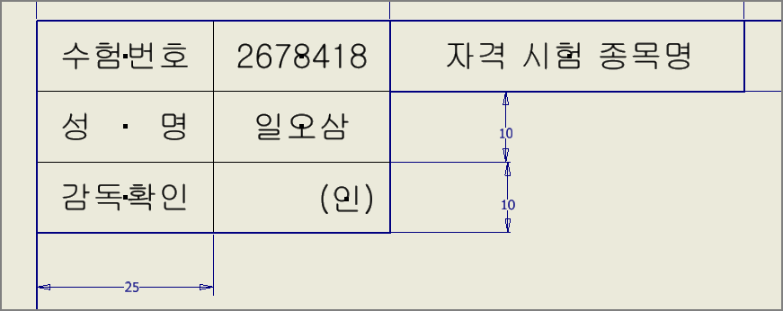 [일치 구속조건]으로 수험번호 문자의 가운데 점을 사선의 중간점과 일치시킨다.