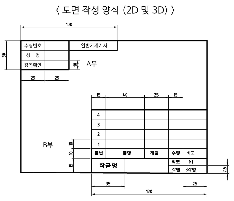 시험 요강에 주어지는 양식의 크기에서 부품란과 표제란의 크기는 전산응용기계제도기능사와 기계설계산업기사는 같고, 일반기계기사도 만드는 방법은 동일하나 치수에서 조금 차이가 있으니 기사 수험생분들은 아래 양식의 치수를 확인하고 따라 그리시기 바랍니다.