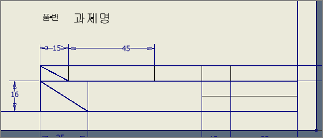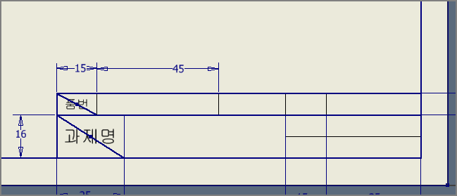 과제명은 레이블텍스트(5mm), 품번은 주텍스트(3.5mm)로 설정하여, 각각 임의의 위치에 문자를 위치시킨 다음, 사선의 가운데 배치한다. (수검란과 마찬가지로 글자는 [일치구속조건]으로 위치시킨다. 가운데 점을 드래그해서 위치시켜도 된다.)
