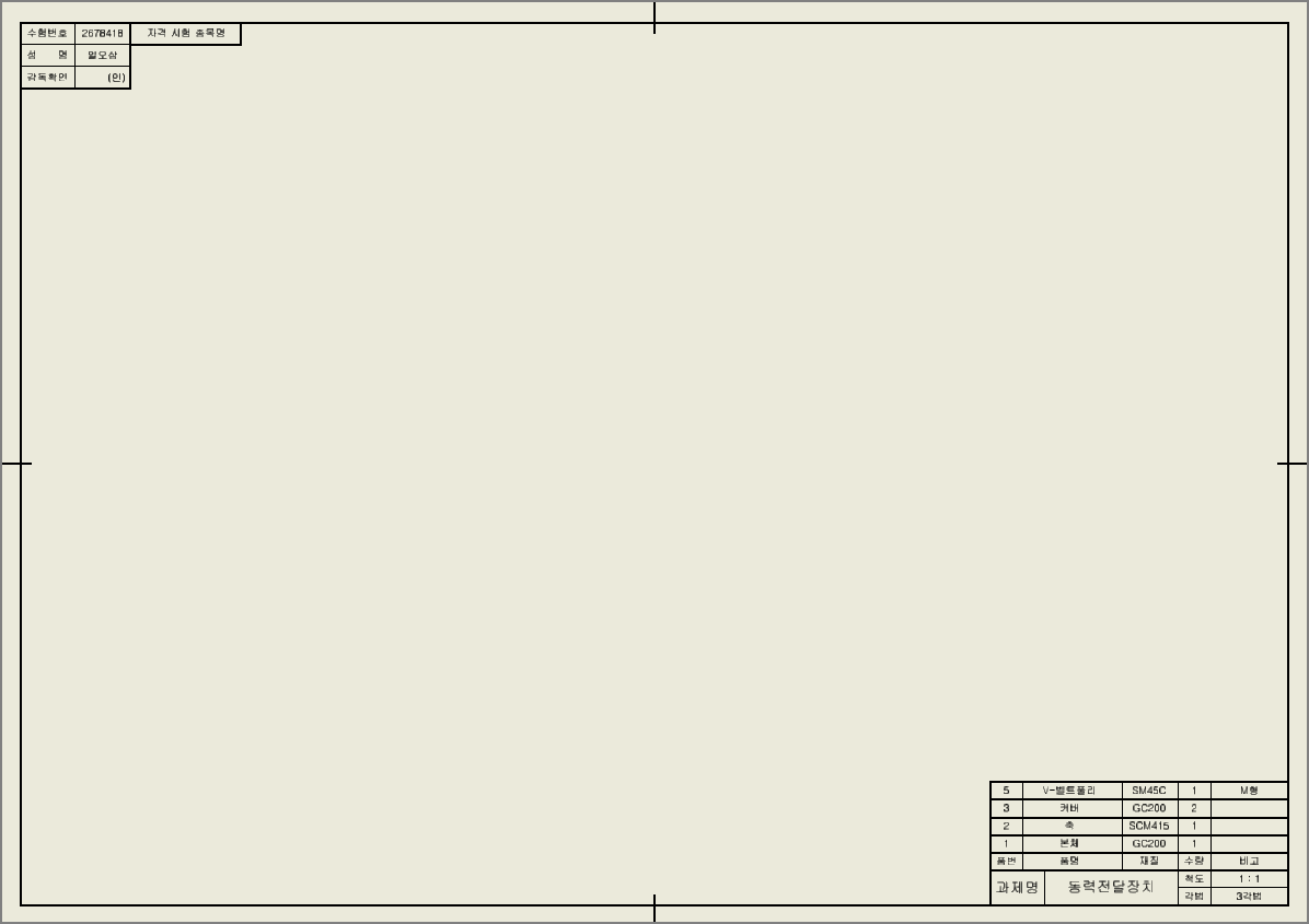과제명과 품번, 품명, 재질, 수량은 작도해야 할 부품에 대해 맞춰야 하며, 비고란에는 V-벨트 풀리가 있을 때는 V벨트의 형별을 적어 놓지만 V-벨트 풀리 외에는 비고란은 비워 놓는다.