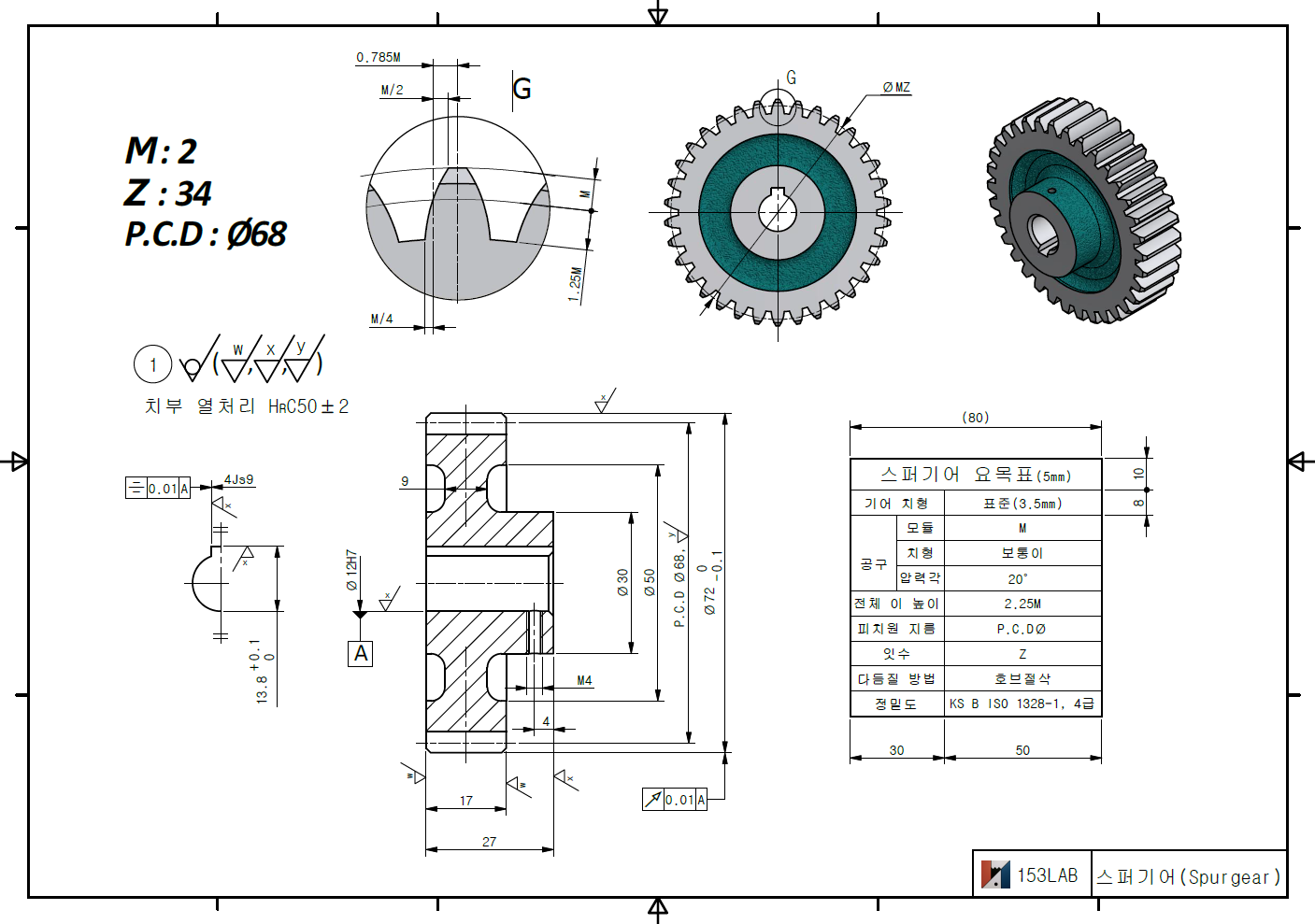 스퍼기어(Spur gear)의 모델링 치수와 부품도, 요목표 작성
