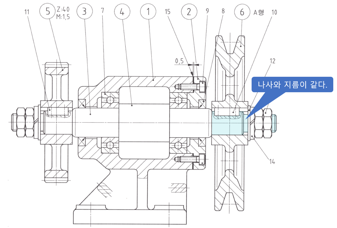 ① 나사의 틈새를 보여주는 경우 - 오른쪽 끝에 수나사, 스퍼기어와 끼워맞춤되어 있는 축과의 사이에 수나사보다 지름이 작은 원통이 보인다.