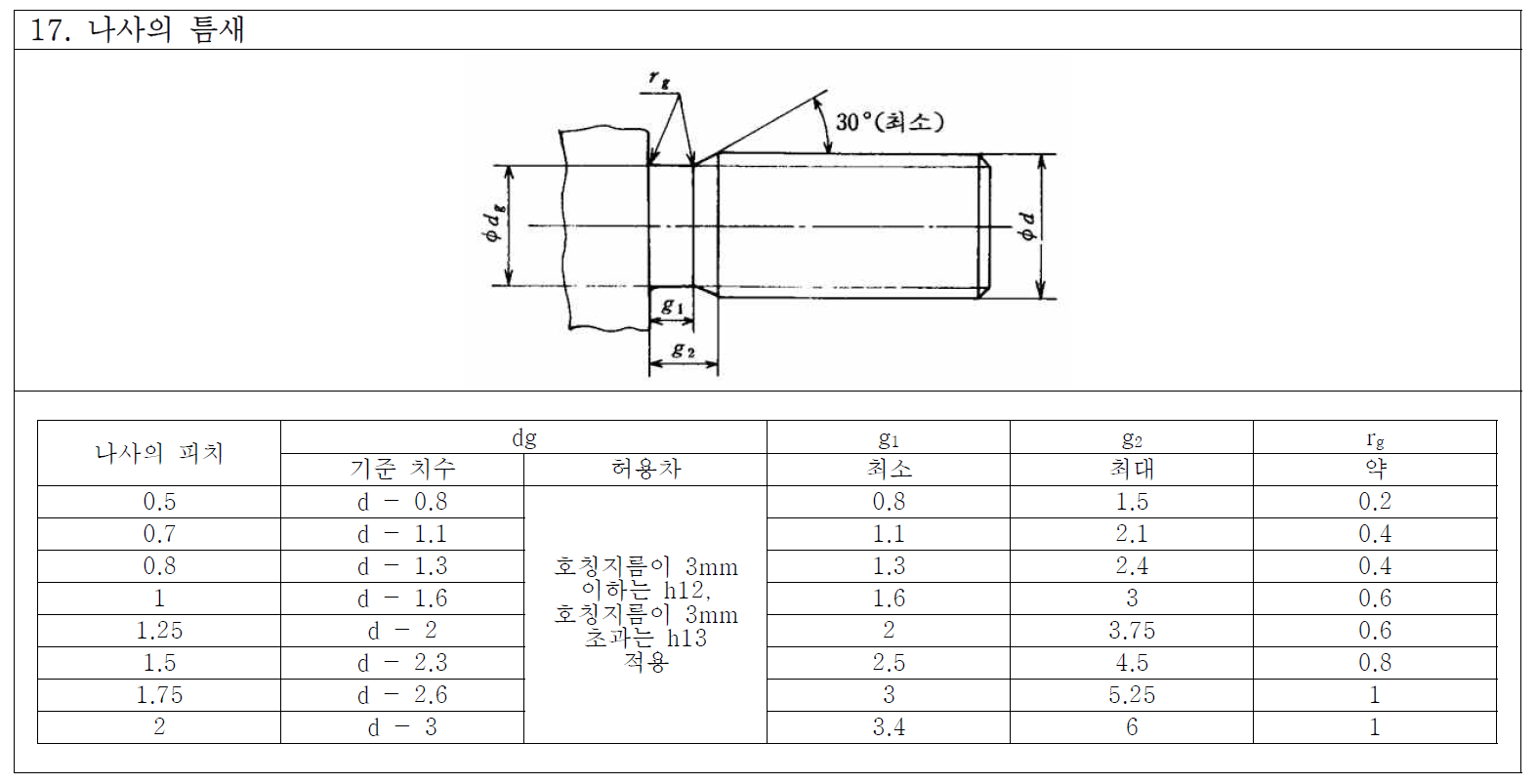 ② KS 규격에서 " 나사의 틈새" 페이지로 와서 피치에 대한 틈새의 치수를 찾는다. (dg : 틈새의 지름, g1: 틈새의 폭, d는 나사의 호칭지름)