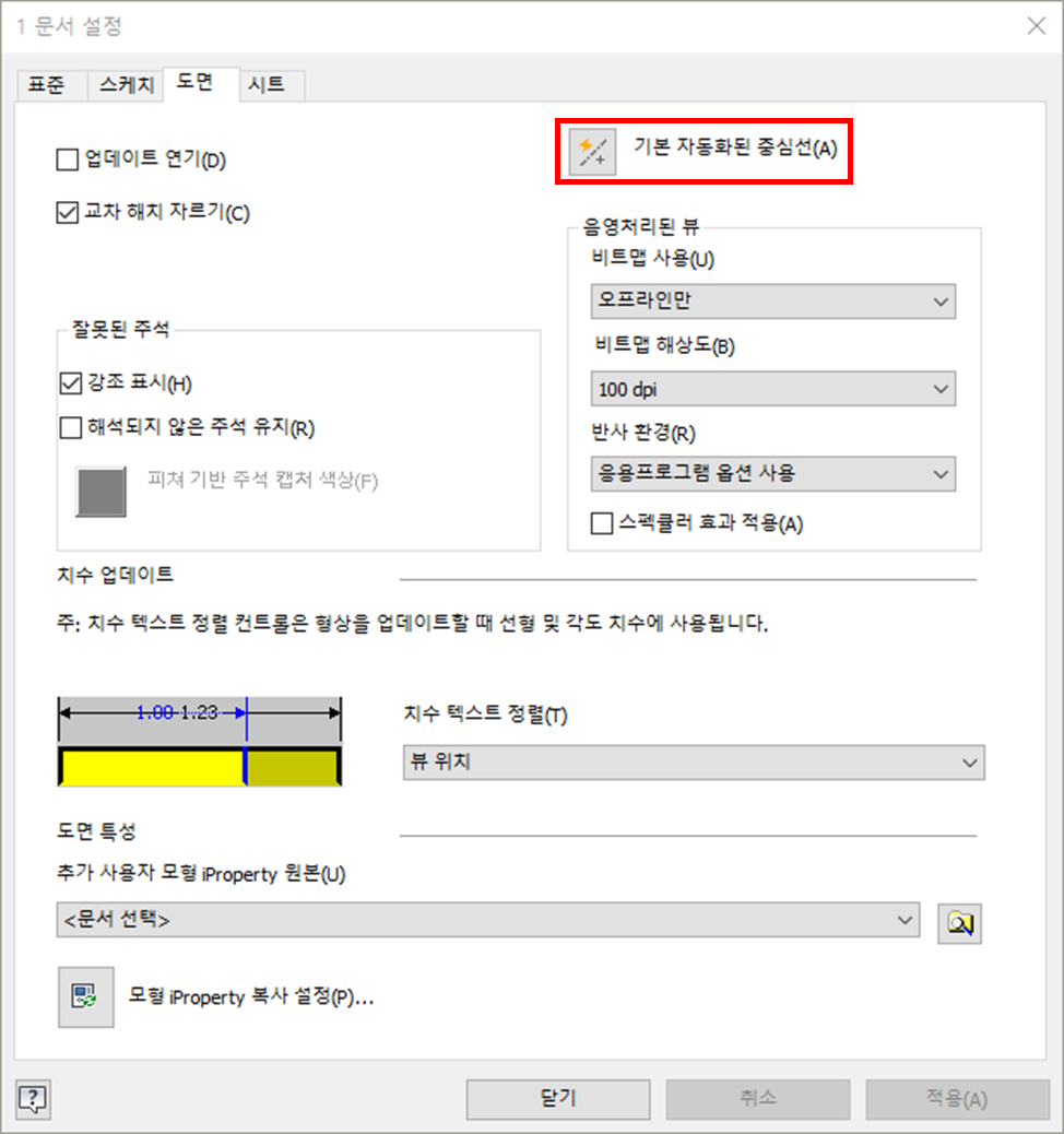 (2) 문서 설정 대화 상자의 기본 자동화된 중심선(A)을 클릭한다.
