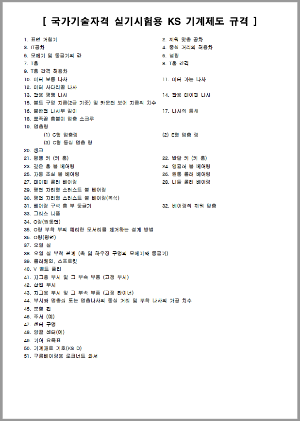 학원이나 과외, 또는 인강으로 CAD 실기를 준비하는 분들은 대부분의 제도법은 배울 것이고 규격은 PDF 범위에서만 찾아 작도하는 연습을 하면 되니 따로 책을 구입할 필요는 없습니다. 본인이 기계 설계로 진로를 가질 것이며, 더 많은 정보를 원하고자 할 때는 필히 KS규격집을 구입하여야겠죠. 감사합니다.