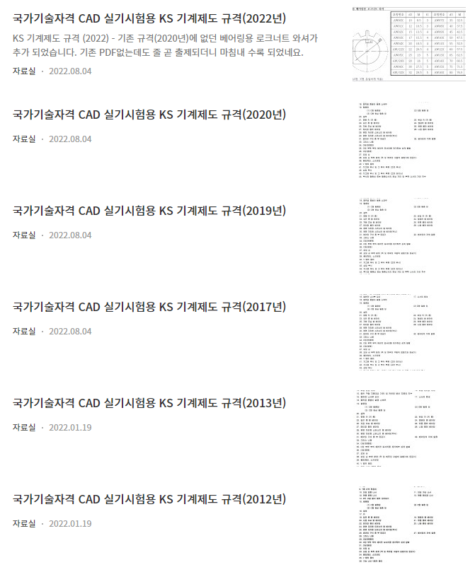 2012년부터 전산응용기계제도기능사, 기계설계산업기사, 일반기계기사 CAD 실기 시험을 볼 때, 산업인력관리공단에서 배포하는 "국가기술자격 CAD 실기시험용 KS 기계제도 규격" PDF를 보면서 시험을 치른다.