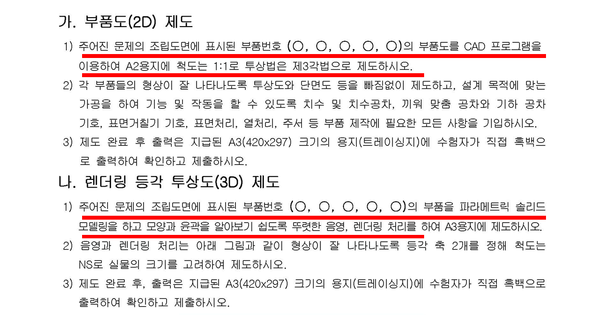 하지만 도면작업이 메인입니다. 도면작업이 제일 시간이 많이 소요되며, 채점은 도면 작업한 결과물인 출력물로 채점합니다.