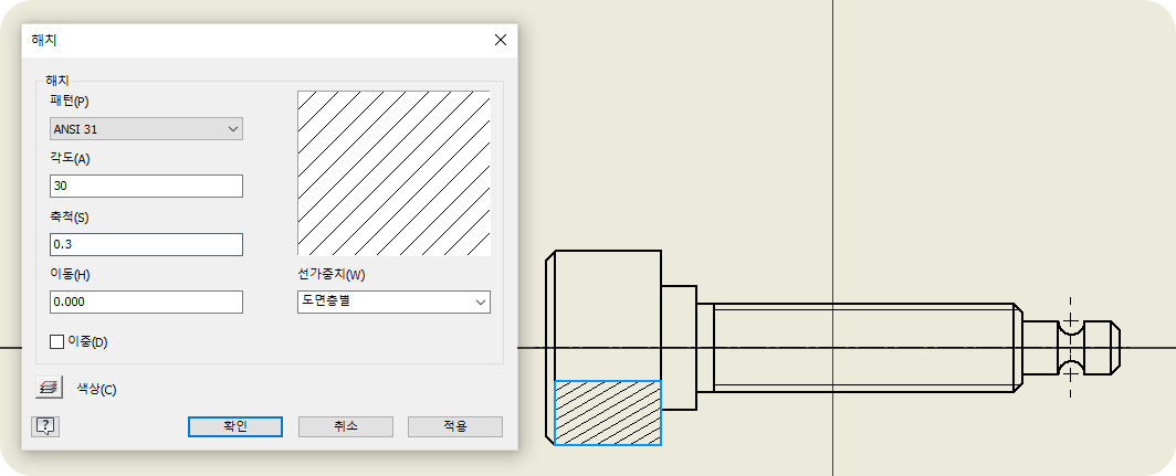 [ 해치 영역 ] 버튼을 클릭하고 사각형 내부를 지정한 후, 해치 대화상자에서 각도는 30, 축척은 0.3을 지정하고 확인한다.