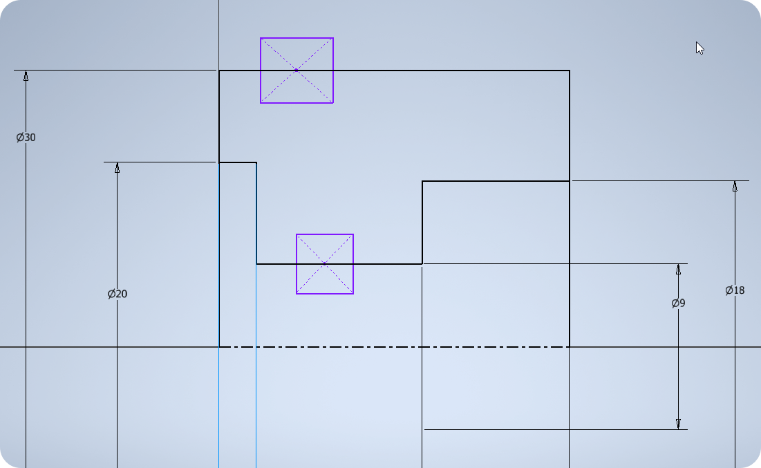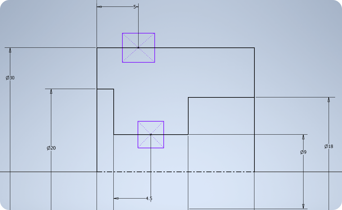 ② O링 홈의 중심선을 그리되 홈의 안쪽면이 모두 보일 때는 중심선이 모두 있어야 한다. 중심선이 원하는 데로 만들어지지 않으면 스케치에서 직접 작도한다.