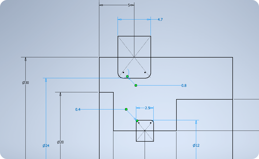 ⑧ 찾는 규격을 G, d, D를 적용하여 스케치를 완성한다. 필렛(R)도 차후 3D에서 주려면 불편하므로 함께 주도록 한다.