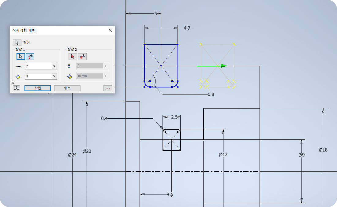 ⑨ 윗쪽에 O링 홈은 직사각형 패턴으로 하나 더 복사한다. 개수는 2개, 간격은 8로 한다.