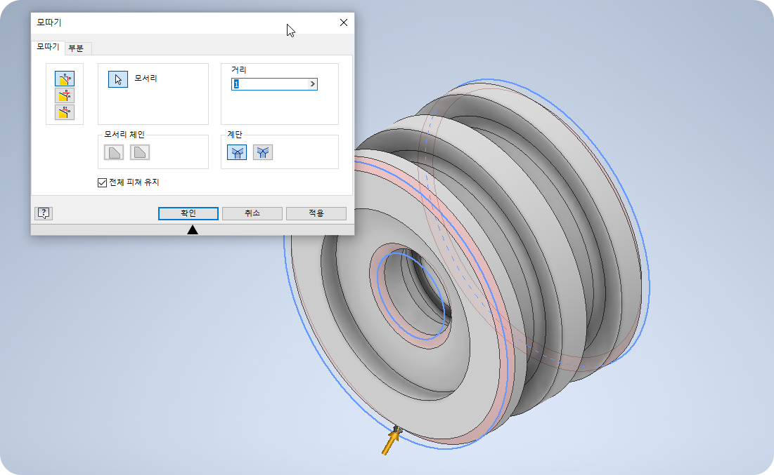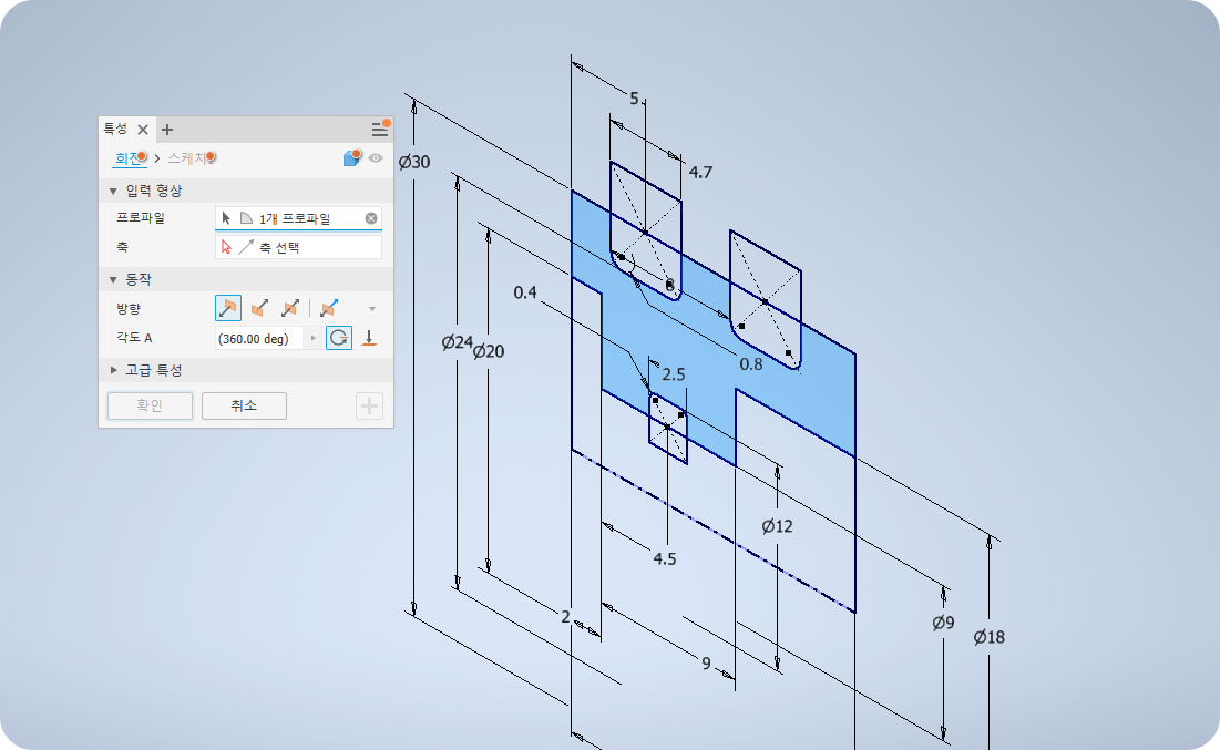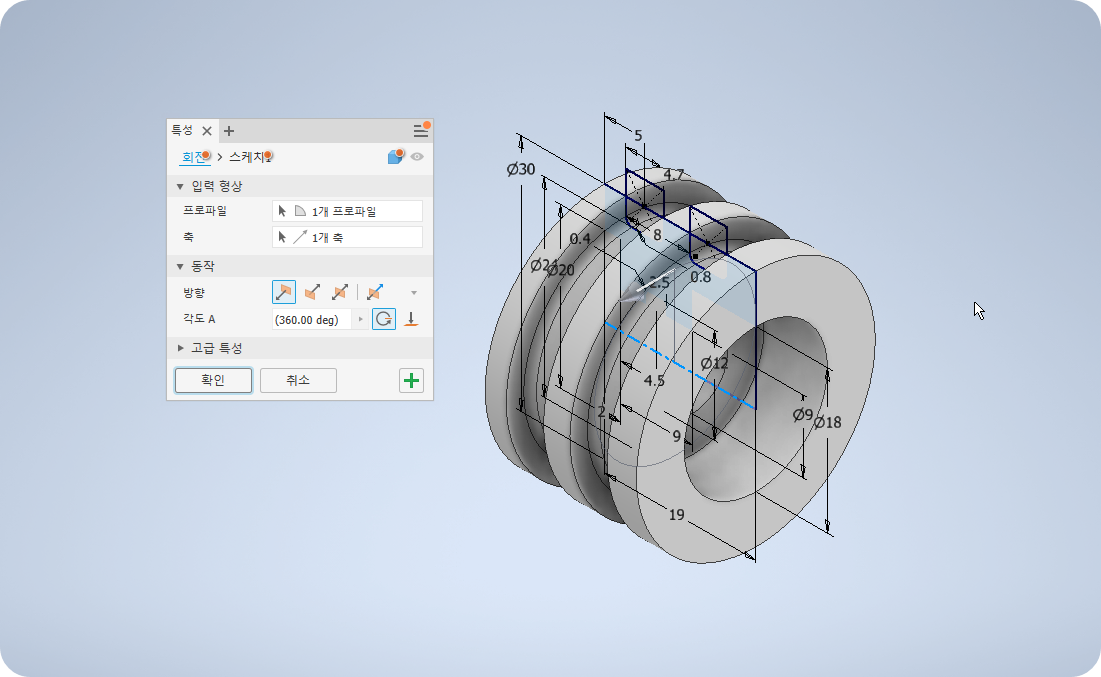 ⑨ 회전하여 솔리드바디를 만들고 모떼기를 주어 완성한다.