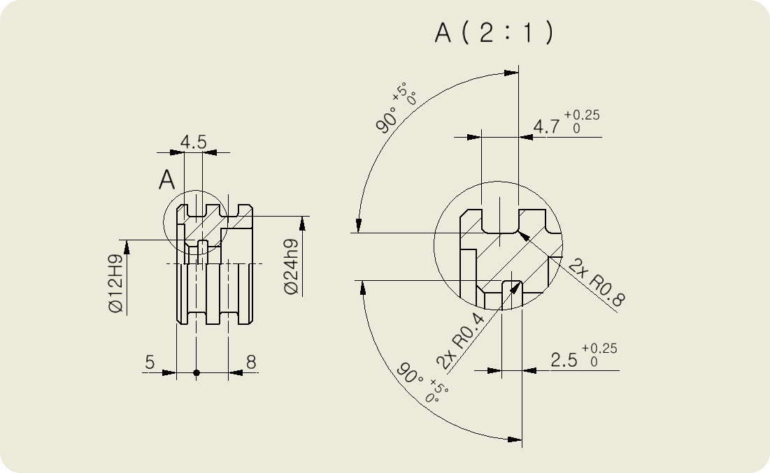 ⑤ 끼워맞춤공차와 치수공차를 적용한다. O링 안 지름에 끼워지는 축은 h9, 바깥지름에 끼워지는 구멍은 H9, 폭은 +0.25^ 0으로 항상 동일하다. 각도 공차도 규격에 있는 +5°^ 0을 적용한다.