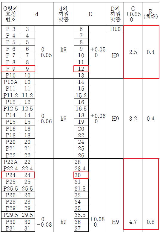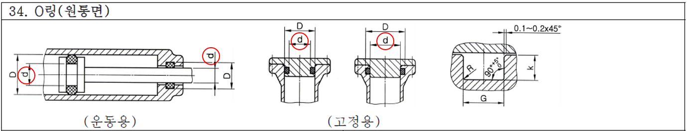 ⑤ KS기계제도 규격에서 O링을 검색하고 안지름에 대한 바깥지름(D), 폭(G), 필렛(R)을 찾는다.