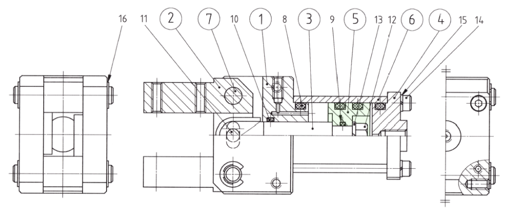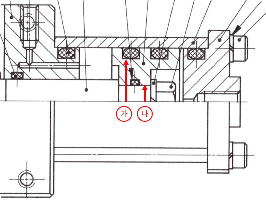 O링은 조립도에서 눌려져 있는 상태로 조립되므로 단면이 타원으로 작도됩니다. ⑤가 피스톤인데, O링의 규격을 찾고 도면작업을 위해 ⑤ 피스톤을 작업해 보도록 하겠습니다.