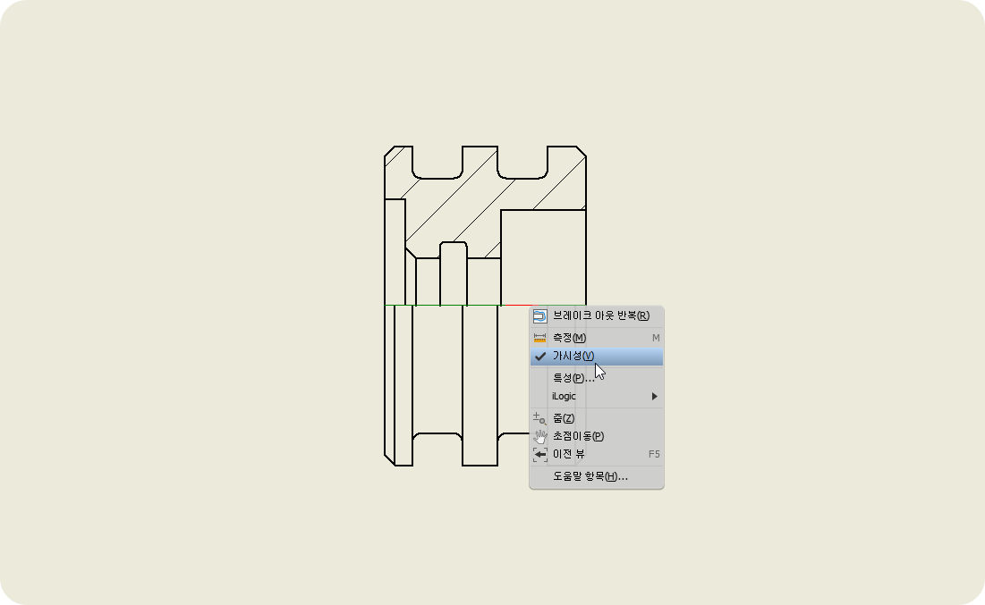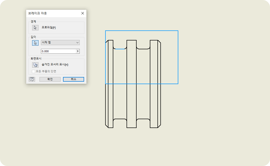 ① 내, 외부를 동시에 보여주기 위해 한쪽 단면을 하고, 브레이크 아웃 선은 보이지 않게 한다.