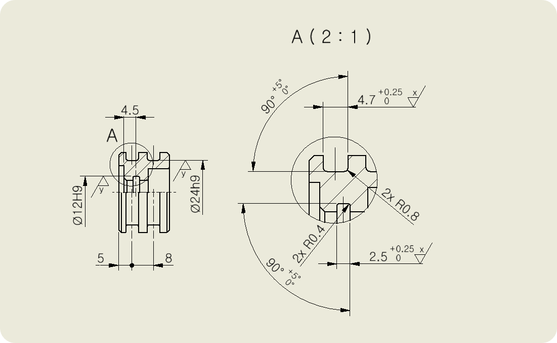 ⑤ 끼워맞춤공차와 치수공차를 적용한다. O링 안 지름에 끼워지는 축은 h9, 바깥지름에 끼워지는 구멍은 H9, 폭은 +0.25^ 0으로 항상 동일하다. 각도 공차도 규격에 있는 +5°^ 0을 적용한다.