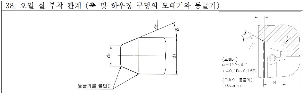 오일실의 안 지름에 끼워지는 축에서의 모떼기 값과 모서리 둥글기(라운드) 값과 모떼기의 표면거칠기는 이러하다.