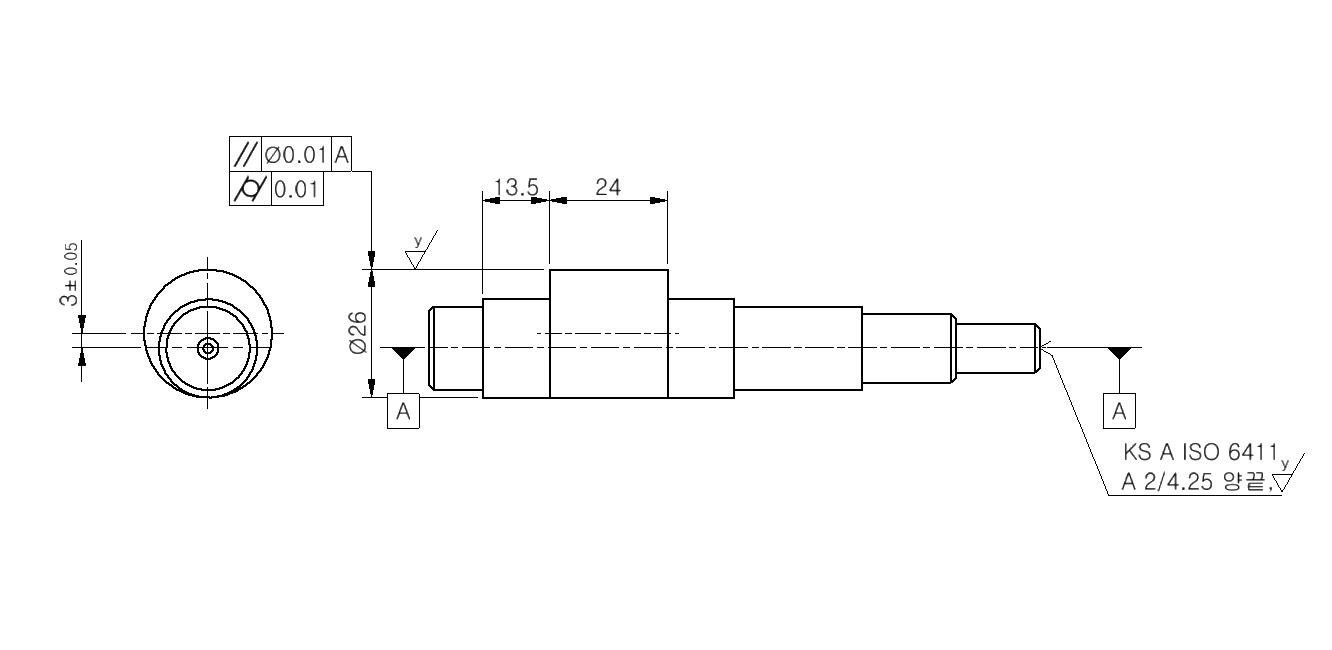 데이텀을 기준으로 편심축에 평행도와 원통도로 규제한다.