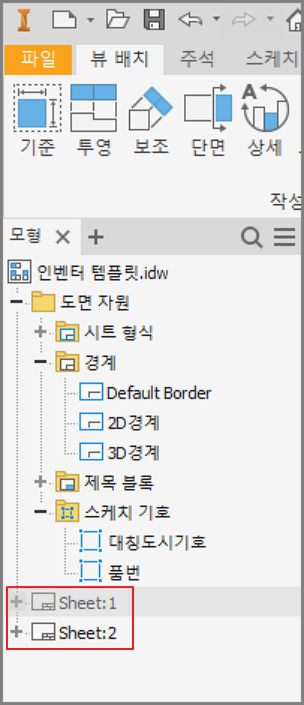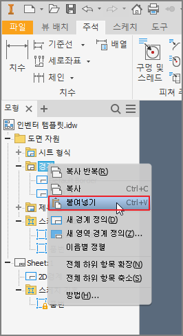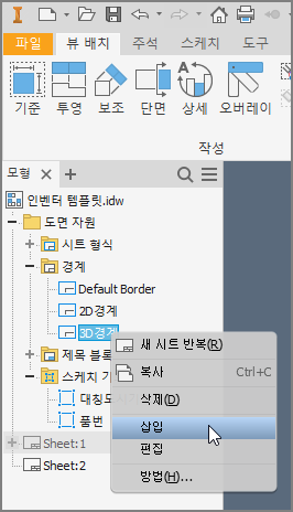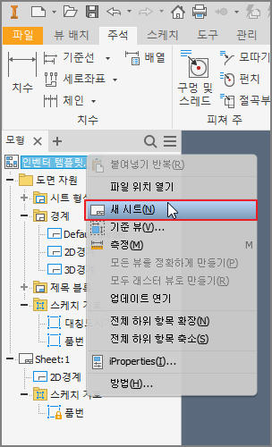 ① 모형검색기의 제일 상단의 *******. idw를 우클릭하여 [새 시트]를 클릭한다.
