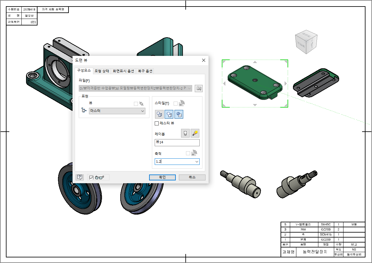 각 부품의 왼쪽에 있는 투상도가 기준뷰이므로, 척도를 수정할 왼쪽 등각투상도를 더블 클릭하여 [도면 뷰] 창을 띄우고, 축척의 칸에 1.2나 1.3과 같이 숫자를 입력한다. ( 작은 부품을 큰 부품보다 크게 하거나 반대로 하는 경우가 없도록 하자. )