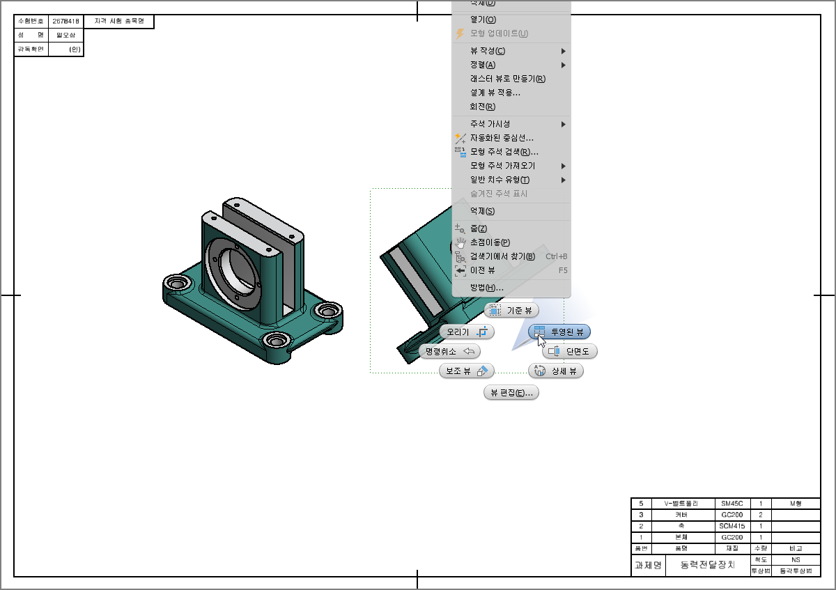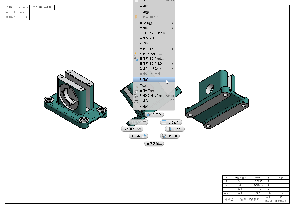 2D 부품도 작업 후에 3D 렌더링 등각투상도 도면을 만드는 방법에 대해 알아보았습니다.