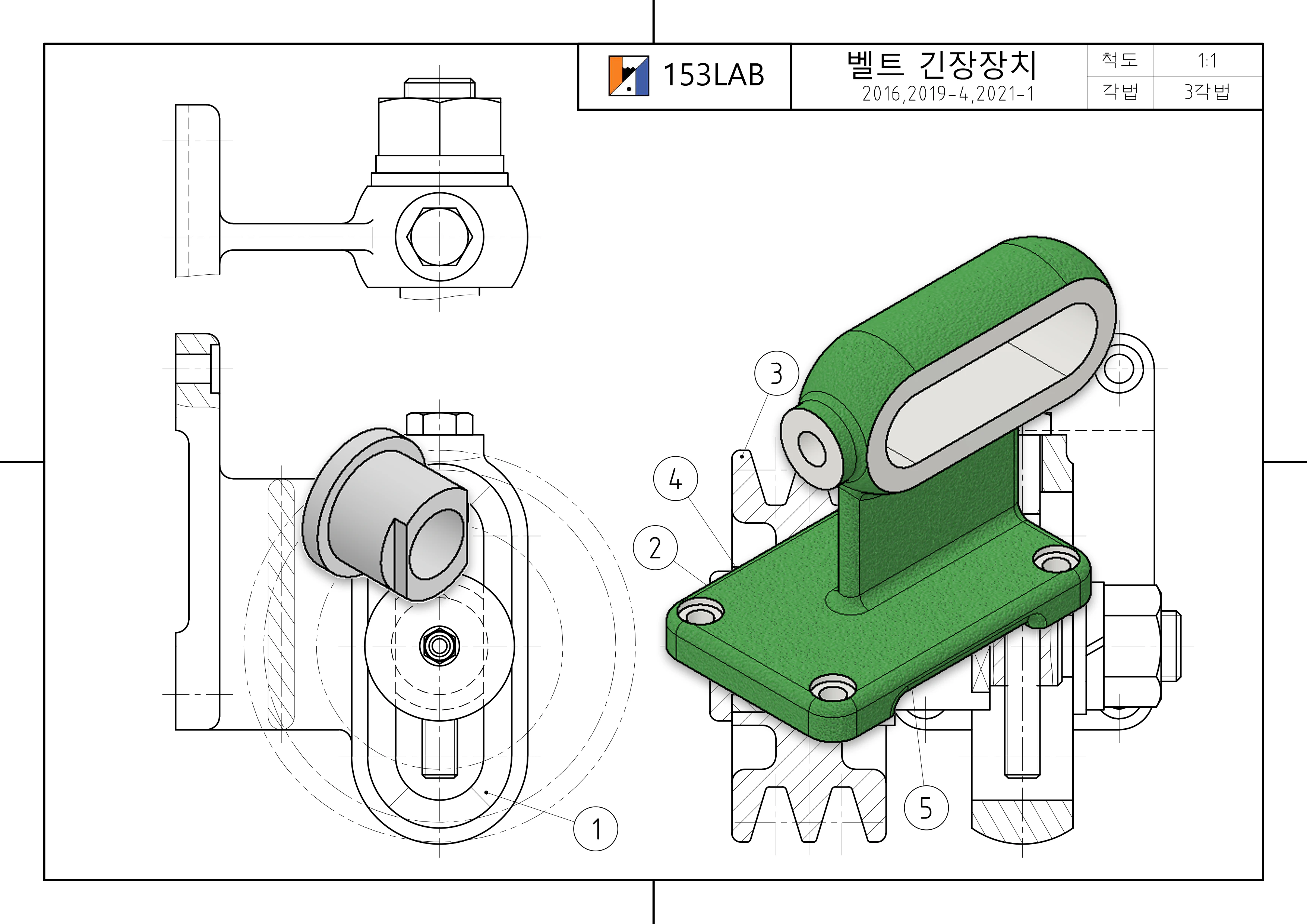V-벨트 풀리로 입력된 회전력을 반대편의 축 끝에 설치될 전달 요소(기어, V-벨트 풀리, 평 벨트 풀리, 스프로킷, 휠 등)에 회전력을 전달하기 위한 장치로써 입력 측과 출력 측의 동력 전달 요소에 따른 베어링의 설치 설계를 목적으로 하고 있다. 베어링하우징 1 V-벨트 쪽에 설치된 볼 베어링은 그 반대편의 볼 베어링 보다 호칭 크기가 큰데, V-벨트 풀리의 회전 시 발생하는 미세한 진동(축 방향, 축 직각 방향의 복합 진동)을 수반하기 때문에 같은 크기의 베어링이라면 악조건을 견뎌야 한다. 같은 회전력을 전달한다 하더라도, V-벨트 풀리, 평벨트 풀리, 스프로킷 휠이 설치된 쪽의 베어링은 호칭 크기를 한 단계 위의 것으로 선택하거나 복렬(2줄) 베어링, 또는 롤러 베어링을 설치하는 것이 안전한 수명을..