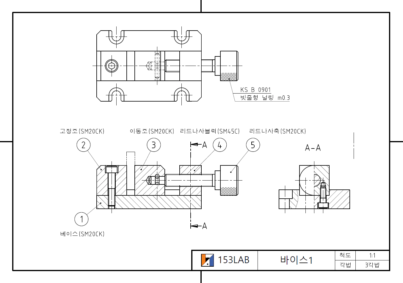 바이스 2 이전 글의 바이스 1과 유사 형태이나 ⑥ 리드나사축이 제자리에서 돌며 ③ 이동조만 움직이는 형태입니다. 공작물이 원통형으로 V-블록이 사용되었으며, ③ 이동조의 이동 제한을 위해 ② 멈춤 쇠(Stopper)가 조립되어 있습니다. ⑥ 리드나사축과 ⑤ 손잡이가 각각의 부품이며, 끼워 맞춤 후에 핀으로 고정하였습니다. 이런 핀의 조립은 정확한 위치와 자세를 위해 '조립 후 동시가공'을 적용하는 것이 좋습니다. ① 베이스의 바닥면에는 위치 결정용 키 홈이 있습니다. 보통 시험에서 H7 공차가 주어지기도 합니다. 153LAB