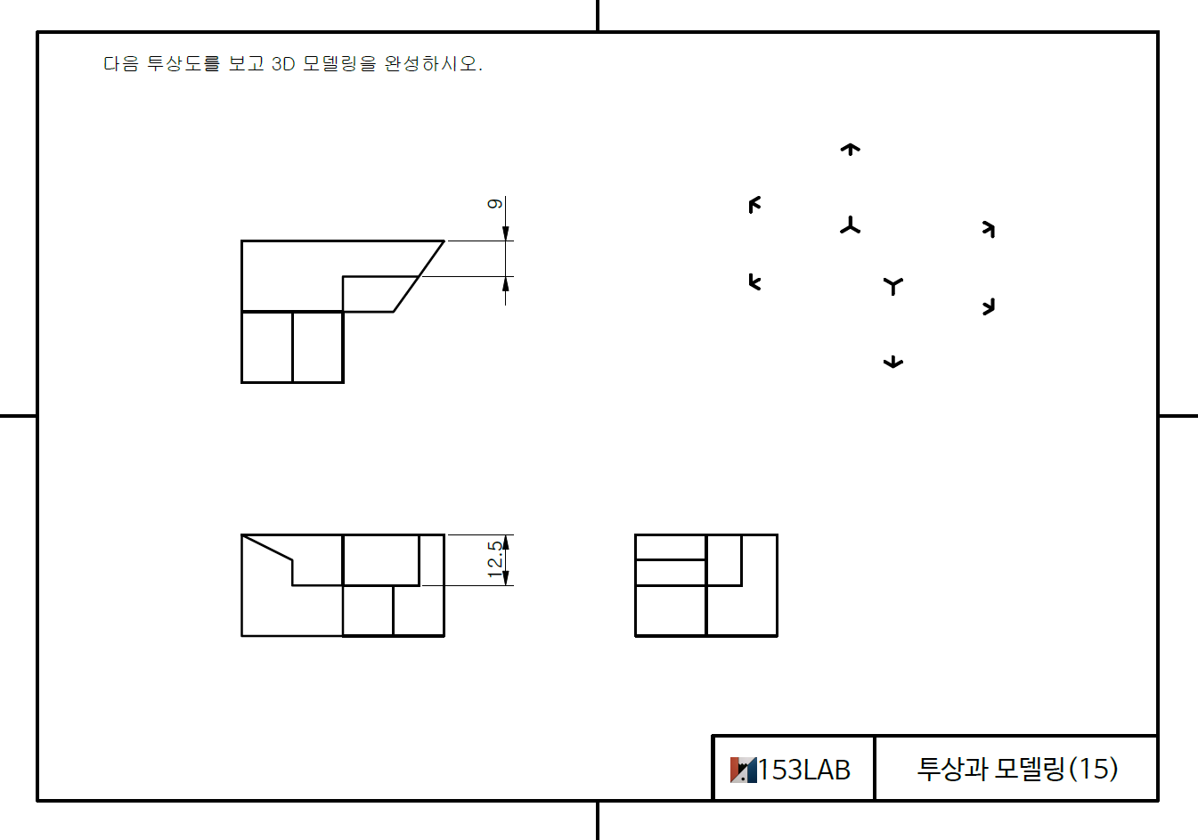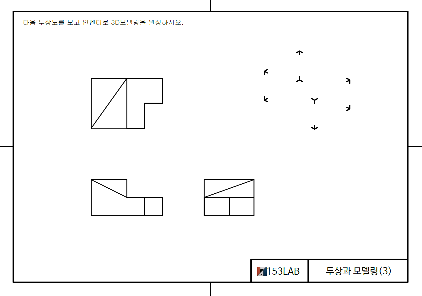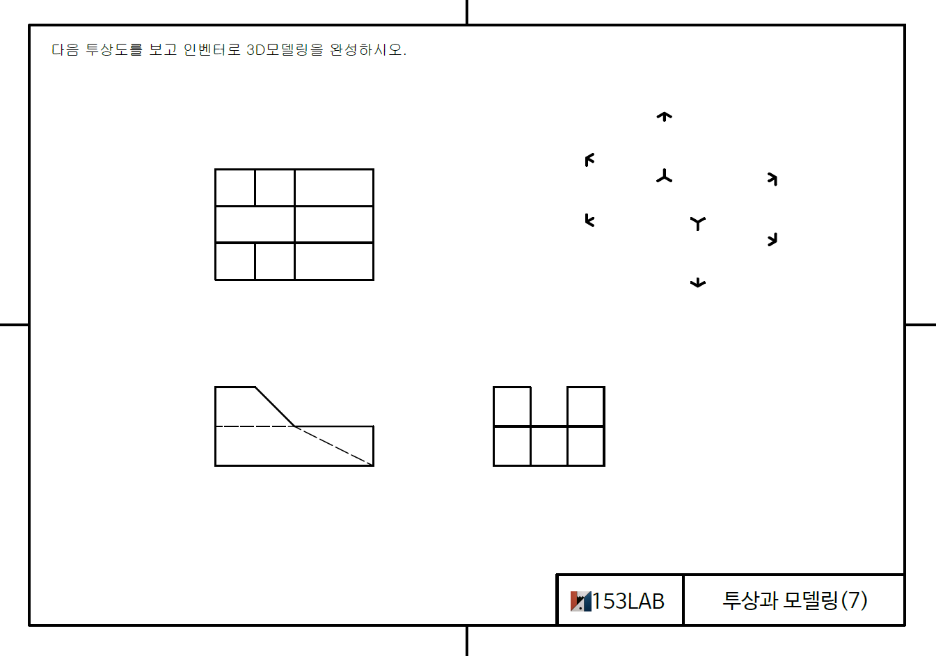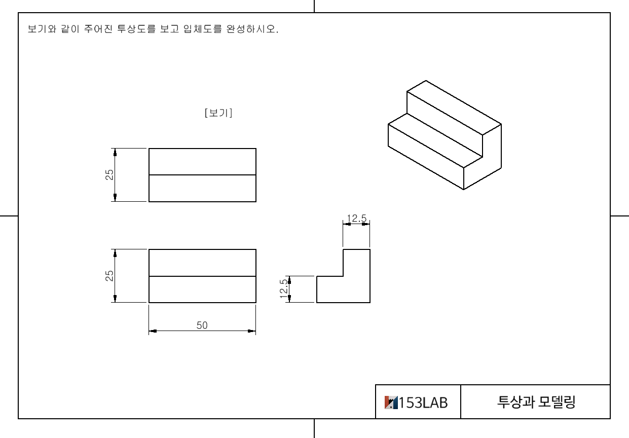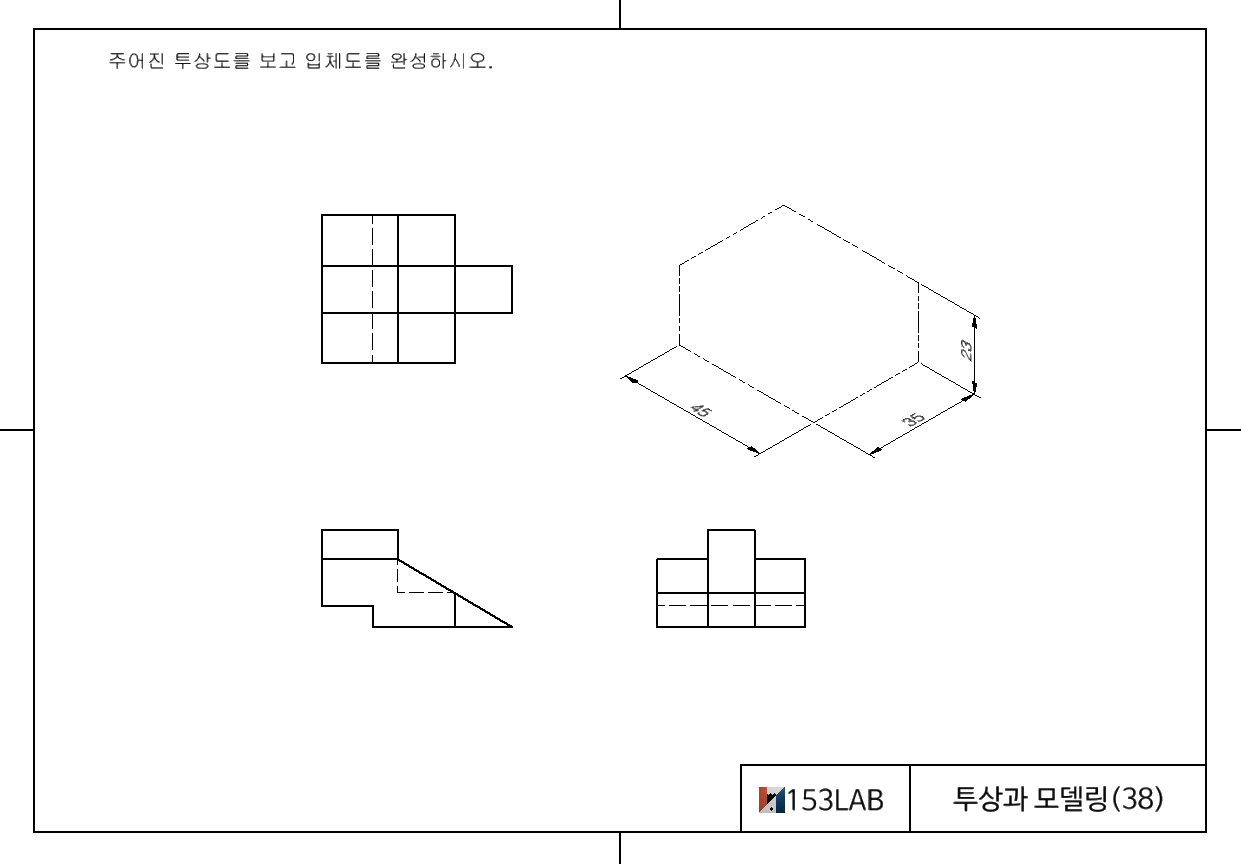 보기와 같이 주어진 투상도를 보고 입체도를 완성하시오.