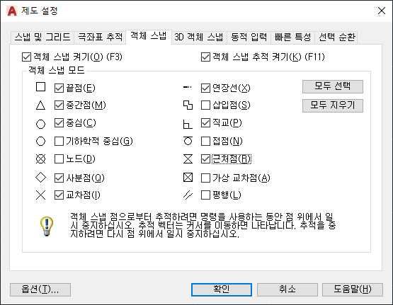 ( 2 ) 그리기 : 윤곽선, 중심마크, 표제란, 부품란, 수검란 6. 한계선, 윤곽선, 중심마크, 표제란, 부품란, 수검란 그리기 템플릿을 만들면 오토캐드에서 자주 사용하는 명령을 익힐 수 있다. 매일 최소 1번씩 연습하며 작업형 시험 시간의 2/3를 차지하는 2D 작업 속도를 올리도록 하자. 현재 레이어는 외형선(ISO)으로 설정한다. ① OSNAP 설정 ( Auto Osnap 세팅, 단축키 OS, ON/OFF : F3) ② 한계선 (도면의 경계 A2 594,420) , 윤곽선, 중심마크 만들기 REC ( 3 Rectangle : 사각형 ) 엔터 > 0,0 엔터 > 594,420 엔터 O ( 4 Offset : 간격 띄우기 ) 엔터 > 10 엔터 > 한계선 선택 > 안쪽 영역 선택 > 엔터 SPACE..