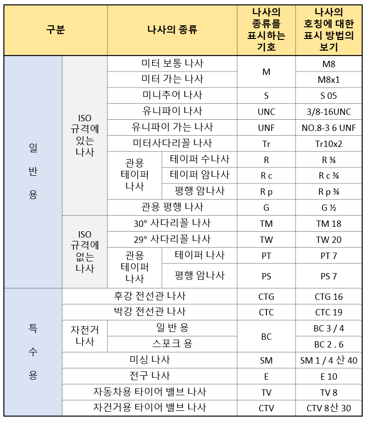 나사의 표시 방법 나사산의 감긴 방향 나사산 줄의 수 나사의 호칭 - 나사의 등급 1. 나사산의 감긴 방향① 나사산의 감긴 방향은 왼 나사 일 때 "왼" 자로 표시 또는 "L"또는 "LH"를 사용 왼 M10x1 L M10x1 (LH M10x1)② 오른나사일 때는 표시하지 않는다. M10x1 2. 나사산의 줄의 수① 한 줄 나사인 경우 표시하지 않는다.② 여러 줄 나사인 경우 "2줄", "3줄" 표시 또는 "2N", "3N"을 사용2줄 M10x1 2N M10x1 3. 나사의 호칭법① 나사의 종류를 표시하는 기호, 나사의 지름을 표시하는 숫자, 및 피치 또는 25.4MM(1")에 대한 나사산의 수를 사용하여 나타낸다. 나사의 종류를 표시하는 기호 ..