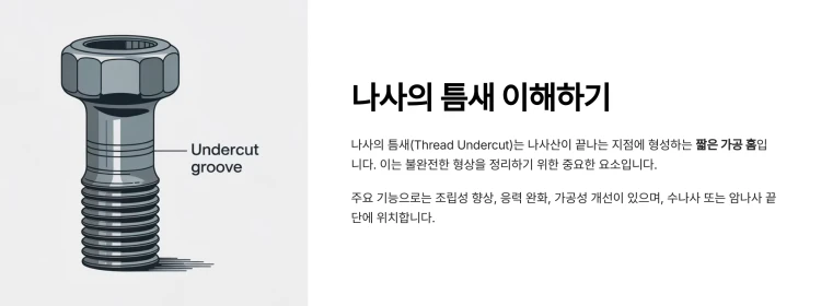 나사의 틈새(Thread Undercut)는 나사 끝단에 만든 짧은 홈으로, 불완전한 나사산을 제거하고 부드러운 체결과 응력 분산을 유도하는 기능을 합니다.